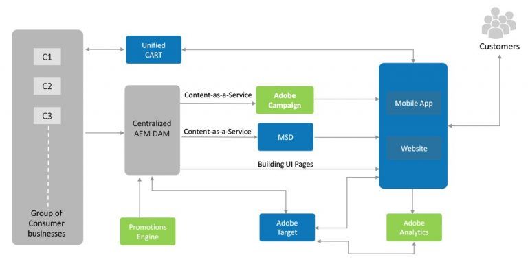 All these additional features are developed as microservices and integrated into AEM and group’s backend systems.